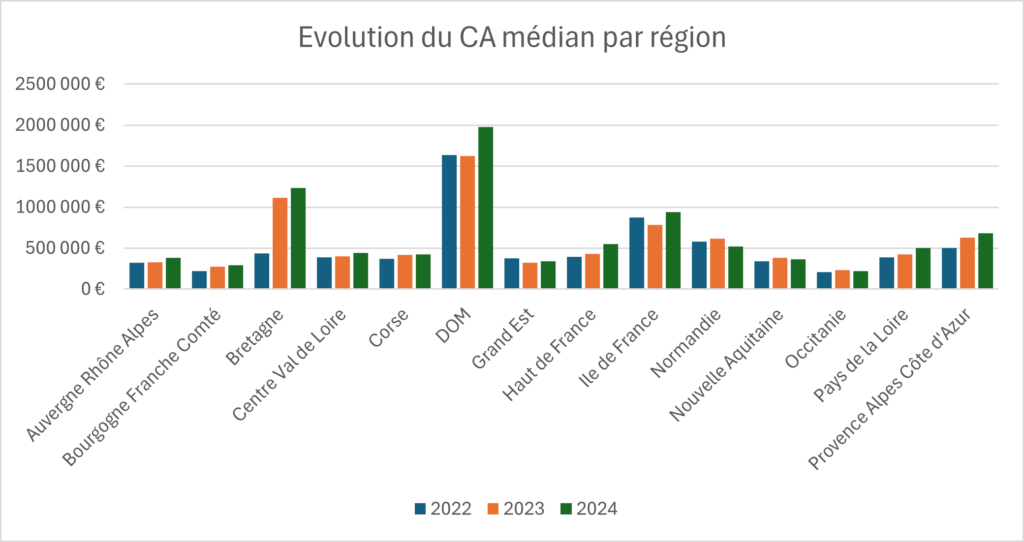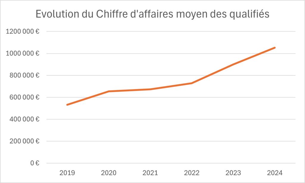 On peut affirmer que cette évolution du chiffre d’affaires des entreprises qualifiées concerne l’ensemble des entreprises puisque le chiffre d’affaires médian est également en évolution. Au niveau national, l’augmentation moyenne du chiffre d’affaires médian des entreprises qualifiées OPQTECC est de 11%, pour atteindre en 2024 un peu plus de 450 K€.