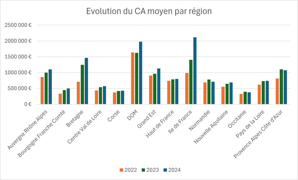 On constate sur le graphique ci-dessus que le chiffre d’affaires moyen des entreprises qualifiées varie selon les régions : de moins de 400 K€ en Occitanie à plus de 2 M€ en Ile de France.