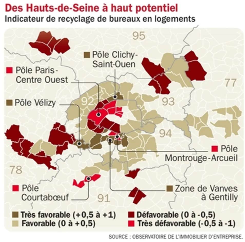 Une étude de l’ORIE a établi un indice évaluant le potentiel des communes franciliennes en matière de recyclage des bureaux vides en logements. Clichy/St-Ouen, Vélizy-Villacoublay, Vanves et Gentilly offrent le meilleur potentiel de changement d’usage, suivis de Clamart/Le Plessis Robinson, La Défense et le secteur allant d’Asnières-sur-Seine à Villeneuve-la-Garenne, soit une partie significative des Hauts-de-Seine.